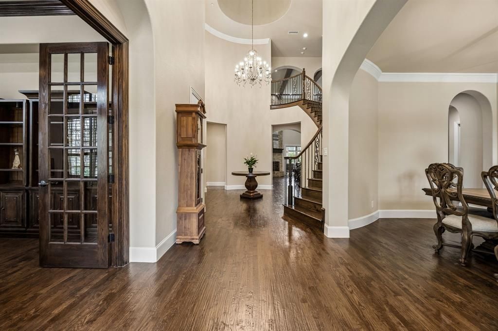 Meticulously maintained Southlake Shady Oaks home combines timeless charm, modern luxury focused on entertainment and privacy. Double iron doors open to truly special grand domed foyer, elegant chandeliers, and curved staircase. Captivating spacious, light-filled w soaring ceilings and large windows flooding home w natural light. In heart of home is expansive open concept family rm and kitchen showcasing a ~1400 bottle climate-controlled wine cellar. Family rm w fireplace, 2 sets of 12-foot collapsible doors open to covered patio w fireplace and views of east-facing outdoor oasis surrounded by mature evergreens creating a tranquil private haven. Claffey built pool, spa and covered outdoor kitchen w built-in grill, XL Big Green Egg, side burners, sink, frig, 2 drop-in coolers, seating and lg storage closet. Lounge on covered patio, host summer barbecue, or simply enjoy serenity of your surroundings. Inside, gourmet kitchen is a chef’s dream, outfitted w top-of-line appliances: built-in Sub-Zero frig, 6-burner Wolf gas range, Wolf double ovens, two Bosch dishwashers, a warming drawer, dual sinks, and more. Wet butler pantry is perfect tea coffee nook. Luxurious serene primary suite retreat w sitting area, dual vanities, separate tub, dual entry dual showerheads and dual body sprayers, including his-and-hers closet w tornado storm shelter doubling as a secure safe. On 1st floor is a large secondary ensuite bedrm, private study and media rm can open or close to adjacent game rm space, w wet bar and pool bath right inside patio door. Upstairs, 3 generously sized ensuite bedrms, another game rm w wet bar and access to a covered balcony overlooking lush yard. Every detail has been thoughtfully crafted to deliver both style and functionality including specifically designed home audio-video features to satisfy tech savvy. Walk to top-rated Carroll schools, Bicentennial Park, and The Marq. Short drive to Southlake Town Square, amazing restaurants, shopping and DFW Airport.