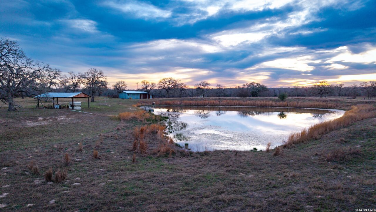 Longhorn Oaks Ranch is a turnkey recreational ranch in a highly desirable location approximately one hour from both San Antonio and Austin. This ag-exempt property is cross-fenced into four pastures with excellent grazing and hay production potential. The land is studded with mature live oak and post oak trees and is teeming with wildlife, including whitetail deer, dove, and the occasional feral hog - making it an outstanding hunting and recreational property. At its fullest, the 2 acre stock pond features trophy-size catfish (that will eat out of your hand) and sits near a 20x30 pole barn, creating the perfect gathering spot. There is a paddle boat that will convey. Additional improvements include a 30x30 barn with 3 cattle working pens and a loading chute. The well-maintained 3 bed / 2 bath, 1,400 sq ft mobile home sits on a concrete slab with electric and plumbing run through the slab for long-term stability and durability. Large oaks provide beautiful shade around the home. Paved frontage on two sides with easy access off County Road 435 ("Longhorn Road"). Property is turnkey with furniture, tractor, and implements negotiable, plus two 8x20 connex containers for storage. Ready for immediate enjoyment as a weekend retreat, hunting property, or secondary home.