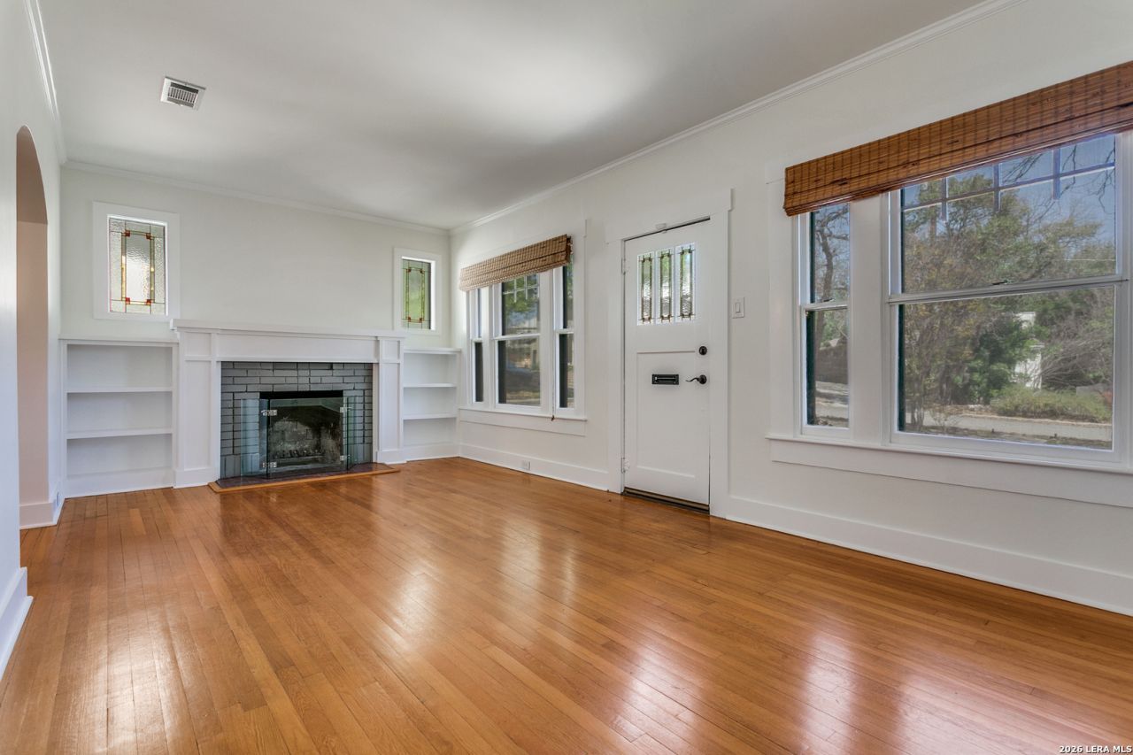 Experience the classic charm of Alamo Heights in this beautifully updated 3-bedroom, 2-bathroom residence. Located within Alamo Heights ISD, the homes character is evident from the moment you arrive, with stained glass detailing on the front door and windows flanking the classic fireplace. Original hardwoods carry this charm from the front living room, complete with custom built-ins and a quaint office nook, into the formal dining area and downstairs bedrooms. From the dining room, the layout flows through the kitchen into a spacious back family room anchored by saltillo tile, additional bookcases, and more stained-glass accents. Both bathrooms have been nicely updated, offering modern convenience while maintaining the homes original charm. The floor plan extends upstairs to a secondary living space and an additional bedroom, providing an ideal retreat for children or guests. Outside, the spacious backyard features low-maintenance rocky landscaping and a functional slab-an ideal foundation for a grill or fire pit. With its versatile living areas and unique architectural details, this home is the perfect fit for someone seeking comfort and character.