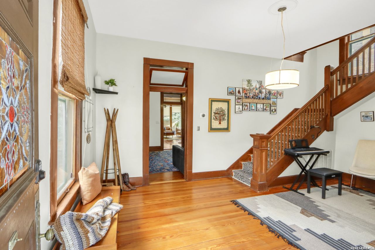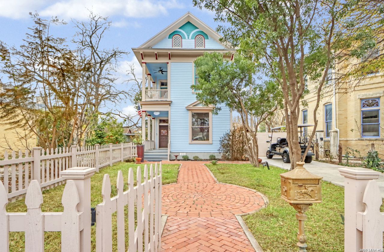 Built in 1905 for a relative of King William, resident Hugo Griesenbeck, who lived just to the right, this striking Victorian holds a meaningful place in the neighborhoods story. Its even said to sit beside the oldest home in the district. The original millwork is captivating-intricate, purposeful, and remarkably intact. Rich hardwood floors extend throughout, anchoring the interior in character and heritage. Modest in scale from the street, the home opens into airy ceilings, well-proportioned rooms, and a personality that feels both vibrant and welcoming. The entry sets the tone immediately, offering a gracious introduction each time guests arrive. The front foyer, complete with staircase and built-in shelving, carries the presence of a classic study; distinguished yet comfortable. Its a first impression that feels both refined and timeless. At the rear of the home, the family room is lined with windows that invite in soft daylight and frame views of the backyard. Its a space that naturally encourages you to linger. Nearby, youll find a full bath with shower and a laundry room that smartly serves double duty as a pantry. Just beyond the back steps, curated landscaping, a paver patio, established trees, and a pergola create an outdoor setting ready to become whatever you envision. Upstairs offers three bedrooms. One featuring an ensuite bath and private balcony, another with its own balcony retreat. Two full baths serve the second level, including one with the timeless clawfoot tub so often cherished in historic residences. Off-street parking accommodates two vehicles in the driveway, with additional room available behind the side gate extending into the backyard; an uncommon convenience for homes of this era. Here, downtown living truly means walkability, with restaurants, cafes, and everyday destinations just steps away. This is more than a Victorian showpiece. Its a tangible chapter of San Antonios past-offering connection, charm, and a story ready for its next steward.
