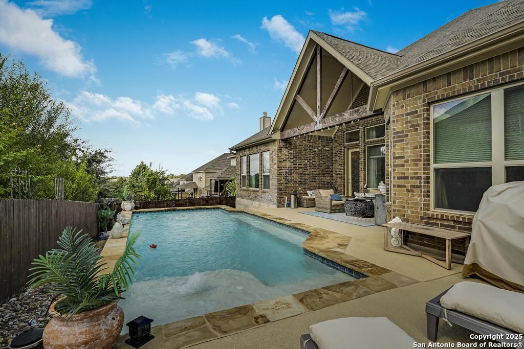 A perfect blend of modern flair and thoughtful design, this former model home offers a spacious single-story layout with elevated finishes throughout. Custom landscaping and lighting set the tone before stepping inside grand entry with hand-scraped wood floors throughout. The family room with a corner gas fireplace opens to the island kitchen featuring antiqued cabinets, a custom chandelier, and a flex room with views of pool. Enjoy your self-cleaning pool, remotely controlled for water features and spectacular oversized covered patio for relaxation. Solar panels, gutters, water softener, and countless additional features!