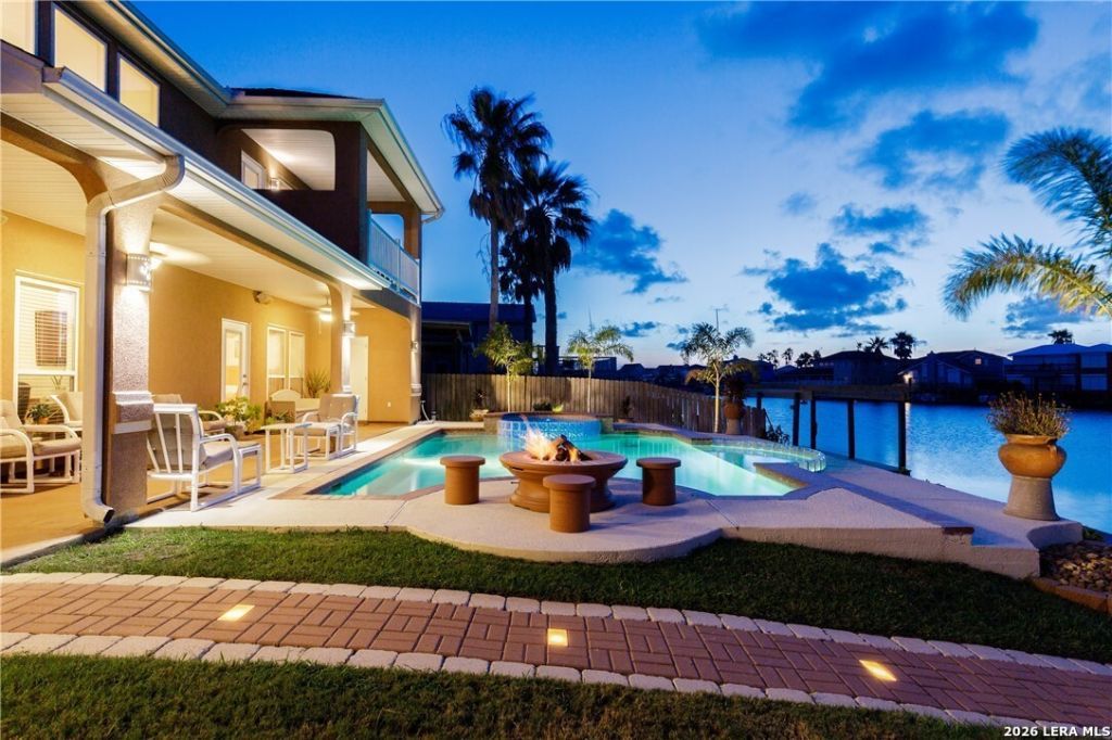 Huge corner lot(10,000+ sq. ft.) with a 3 car garage. Home sits at end of canal with breathtaking views! Wake up in the morning and enjoy your coffee out on one of 3 patios or on your veranda deck. Enjoy an evening swim in the heated pool or spa. Home includes boat dock and lift, covered with a deck to relax on top. Three large bedrooms, primary is down. Two full baths and two half baths, two living areas, 2 large bedrooms (upstairs) both with covered private patios, 1 office and 1 extra room. Upstairs bathroom has a garden jetted tub and separate shower, immaculately clean and kept up for an unique showing experience. Gas fire pit and seats built in with built in gas grill. Circular driveway and corner lot add lots of parking for your guest. Truly a one of a kind package, dont let this one slip away! Furnishings can be negotiated to be included in sale.