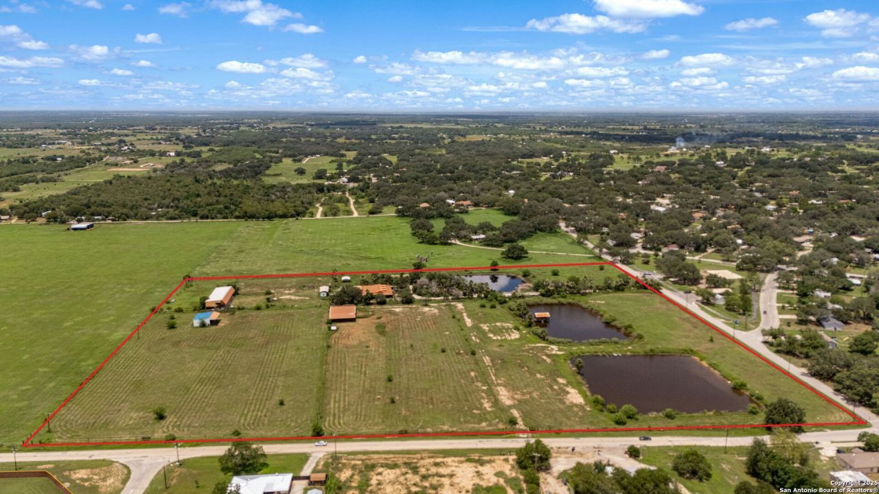 Unrestricted 21+ acre property just minutes from Devine offering exceptional water, infrastructure, and versatility. Property features three stocked tanks with pier and state-approved bridge access, two water wells plus an additional household water meter, and is perimeter fenced and cross-fenced with multiple gated access points. The main residence is a 3-bedroom, 2.5 bath home with two dedicated office spaces, open living areas, and a large wrap-around porch overlooking the ponds and acreage. Ideal setup for work-from-home, ranch operations, or multi-generational living. Improvements include multiple barns and outbuildings, two additional RV/mobile home setups with utilities, chicken coop, koi ponds, and ample space for livestock, equipment, or expansion. Unrestricted land allows for ranching, business use, recreational property, retreat, or future development. Convenient Devine location with quick access to San Antonio while maintaining privacy and wide-open country views.