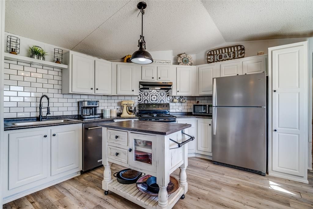 This well-maintained 3-bedroom, 2-bath home, situated on 1 acre, offers comfortable, functional living space with a bright open layout and thoughtful updates throughout. The main living area flows seamlessly into the kitchen and dining space, creating an easy setup for both everyday living and entertaining. The kitchen features white cabinetry, subway tile backsplash, stainless steel appliances, and a center island that adds valuable prep space and storage. Durable wood-look flooring runs throughout the home, giving it a clean, cohesive feel.The primary suite provides a private retreat with its own ensuite bath complete with a relaxing garden tub and generous storage. Secondary bedrooms are well-sized and versatile, ideal for guests, a home office, or hobbies. Both bathrooms offer practical layouts and updated finishes.Outside, you’ll find a fenced yard area, storage building, and generous outdoor space ready for pets, projects, or everyday enjoyment.This is a home that feels comfortable the moment you walk in — a place to settle in, make memories, and truly enjoy the space around you.