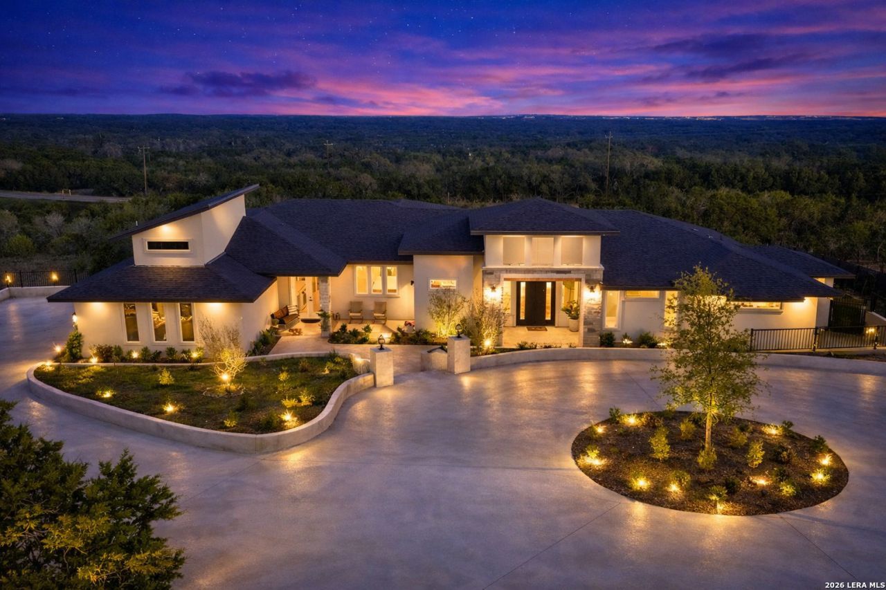 Hill Country Luxury | Custom Home with Sweeping Views in Ramble Ridge Stunning and move in ready! This meticulously crafted custom home sits on a scenic 1.66acre lot in the gated community of Ramble Ridge. Despite feeling like a private retreat, its no more than 10 minutes from local highways and shops. A massive estate style driveway with a 20 ft roundabout provides effortless access to the three car garage and plenty of guest parking. Mature oak trees and solar accent lighting add evening ambiance. A custom concrete stairway with illuminated columns lead to grand 8 ft double iron doors. Inside, a soaring great room showcases basketweave wood beams and a fully open concept kitchen, living and dining area with 180 degree scenic views. The chefs kitchen boasts high end marble countertops with a 2 inch custom edge, a 48 inch JennAir range, a matching 48 inch refrigerator, custom cabinets with built in hood, and a thoughtfully designed cook nook with custom lighting and shelves. A bespoke bar area makes this space perfect for entertaining. Down the hall youll find a custom laundry room with utility sink, quartz counters, abundant cabinetry and space for a secondary fridge. Two secondary bedrooms feature their own bathrooms with walk in showers and closets, plus scenic views. The primary suite serves as a private retreat with custom beams, a huge walk in shower and soaking tub overlooking the lush yard, a private deck for morning coffee, and an expansive walk in closet with island and quartz countertop. An additional bedroom with walk in closet and detached full bath can flex as a guest suite or a personal gym. The fully fenced, gated backyard is landscaped with mature plants and trees and includes a timer controlled irrigation system and fresh sod. With controlled community access, a low HOA fee and the convenience of being minutes from everyday amenities , this custom estate blends hill country seclusion and modern luxury. Come tour today before its gone!