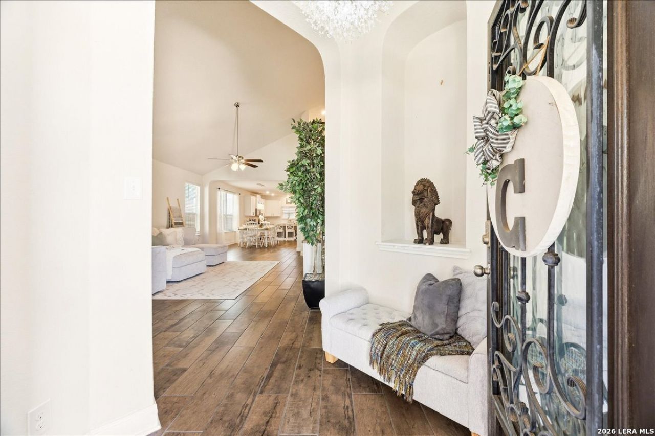 Beautiful 1.5-story home in Copper Canyon in Bulverde, TX featuring a highly functional layout with 3 bedrooms and 2 full bathrooms, plus a study on the main level and a private upstairs retreat with a bedroom, full bath, and game room. The open-concept design includes a spacious kitchen with granite countertops, white cabinetry, subway tile backsplash, gas cooktop, stainless steel appliances, and a large island. All bedrooms offer walk-in closets, and the primary suite features vaulted ceilings. Enjoy incredible outdoor living with a screened-in porch and mounted TV, pergola, covered grilling area, and low-maintenance turf. Additional features include an EV charger and a water softener. Enjoy access to outstanding community amenities including a resort-style pool, splash pad, playground, dog park with obstacle course, and outdoor gathering spaces, all within highly rated Comal ISD and close to shopping and dining. For your peace of mind, the roof is less than a year old, a reverse osmosis drinking water system, and a 10 year builder structural warranty transfer to you as the new buyer. This home offers the perfect blend of functionality, comfort, and lifestyle-schedule your showing today!