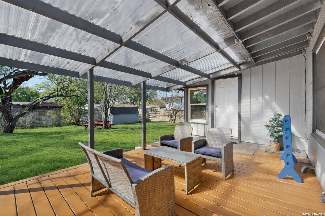 Super cute, well maintained mid-century home centrally located in prime location. Move-in ready with bright, open living spaces and a cozy fireplace. Minutes away from the San Antonio Internation Airport, downtown, shopping, parks, and major attractions. New plumbing, new windows, custom blinds, updated HVAC, updated roof, foundation (transferable warranty), fresh interior paint, refinished tub, gorgeous wood floors, renovated kitchen featuring acacia countertops, an island, and stainless steel appliances. Functional layout with classic charm. Covered patio and generous sized fenced yard perfect for relaxing. Backyard features large shed with electricity, offering ample storage or workshop potential. Dont let this opportunity pass you by; schedule your private showing today!