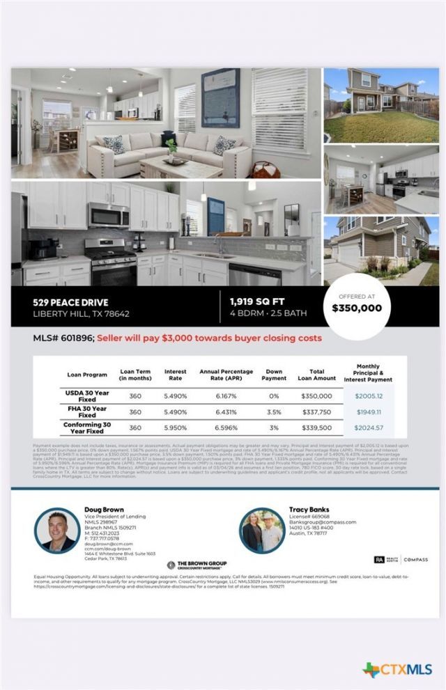 Partially Furnished | $5,000 Seller-Paid Closing Costs Offered | Just Listed ? 529 Peace, Liberty Hill Mirabeau at Santa Rita Ranch | 1,931 Sq Ft | Immaculate Townhome Step into this barely lived-in, like-new townhome offering modern style, spacious living, and low-maintenance convenience in the highly sought-after Mirabeau section of Santa Rita Ranch. Filled with natural light, the home features vaulted ceilings, expansive windows, and an open, airy feel. The thoughtfully designed layout includes larger-than-average rooms and two separate living areas?ideal for everyday living, entertaining, or working from home. Highlights include immaculate condition with the feel of new construction (without the wait), over $7,000 in landscaping upgrades, clean modern finishes, and a smart, functional layout. The HOA covers exterior maintenance, simplifying ownership and helping reduce homeowners insurance costs. Located near The Hub, residents enjoy resort-style amenities including a pool with cabanas, sand volleyball, clubhouse with catering kitchen, coffee & tea bar, entertainment spaces, and The Barn pavilion with BBQ grills. Backs to Santa Rita Elementary (Liberty Hill ISD, opened 2020). Conveying Items: Downstairs includes washer, dryer, refrigerator; primary bedroom wall art (no furniture); kitchen mirror, table & chairs, and rug; living room couch, coffee table, rug, picture over couch, hallway runner, and mirrors by garage door; half bath picture over toilet. Upstairs includes family room couch, coffee table, and small console table (excluding picture above, table under picture, and large wooden shelves); all furniture and wall art in both upstairs bedrooms; and a metal sideboard in the additional bedroom.