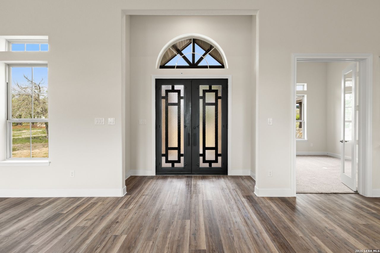NO PID TAXES + FLEX CASH INCENTIVE AVAILABLE*** Experience the perfect blend of privacy, luxury, and convenience on this stunning 1.94-acre cul-de-sac lot in a private gated community in Castroville, Texas. Step inside this thoughtfully designed 4-bedroom, 3.5-bath home featuring a dedicated study, game room, and a showstopping 42-foot great room with soaring cathedral ceilings and walls of windows that flood the space with natural light. The expansive covered patio is ideal for outdoor entertaining or simply enjoying peaceful Hill Country sunsets. Luxury finishes are found throughout double 8 iron entry doors and 8 interior doors to stylish Luxury Vinyl Plank and tile flooring. The oversized primary suite features a bay window sitting area and a spa-inspired bathroom with an enlarged custom shower (complete with ceiling tile, rain head, and frameless glass), a freestanding soaking tub, dual raised vanities with granite counters, and a spacious walk-in closet. The gourmet kitchen has upgraded white cabinetry, granite countertops, stainless steel built-in appliances, a 5-burner gas cooktop, and a separate oven and microwave-perfect for any home chef. Additional highlights include a 3-car side-entry garage with openers, full landscaping with a sprinkler system. Medina ISD