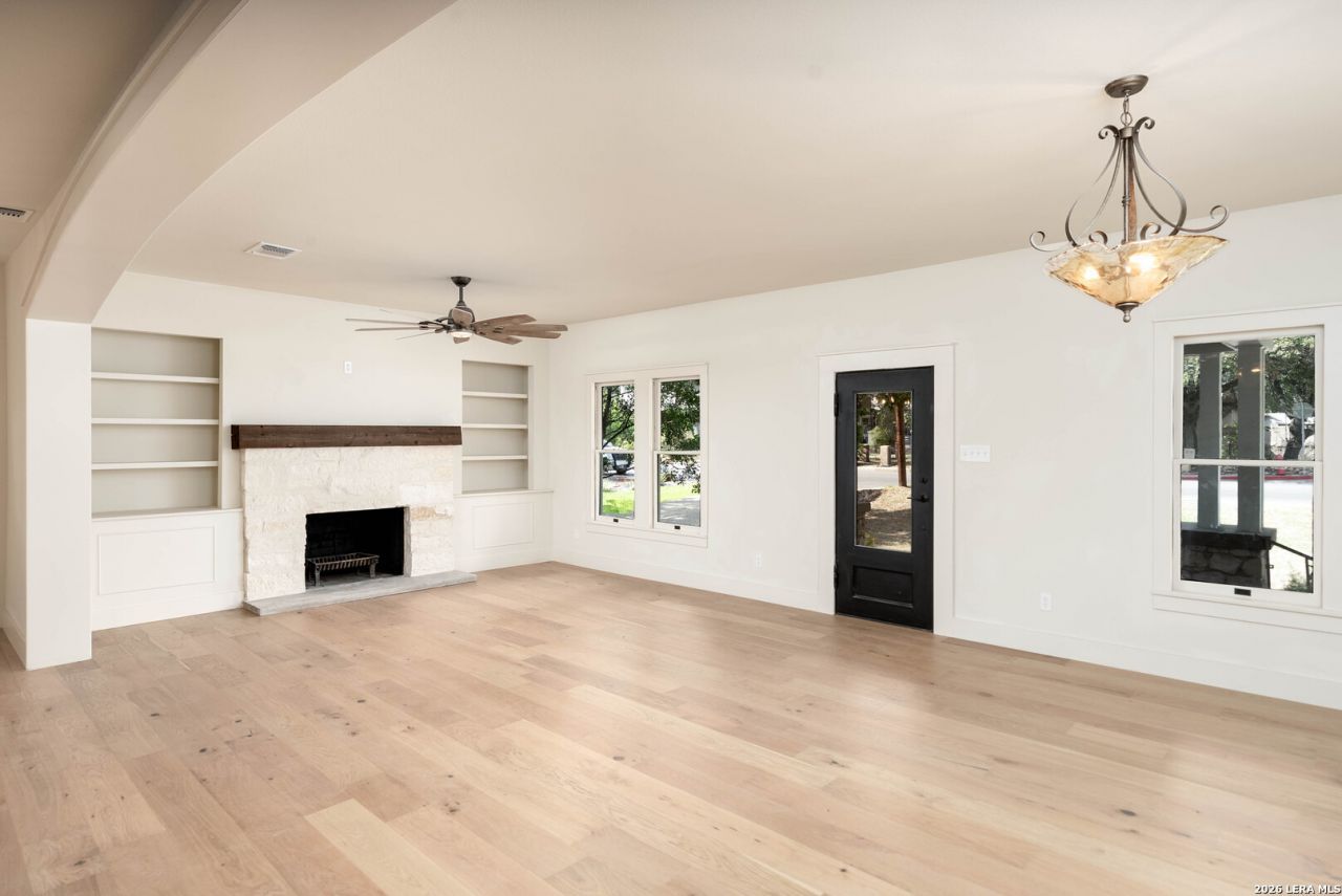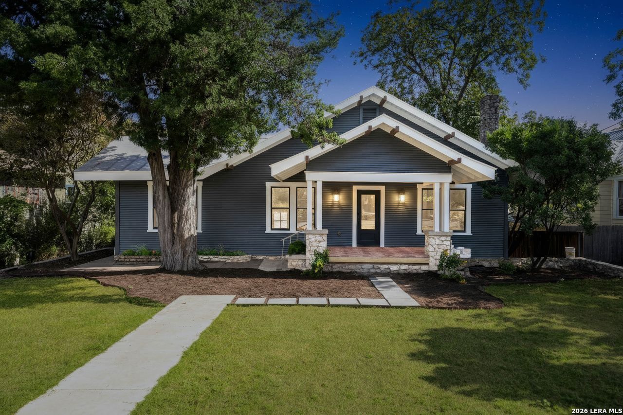 Nestled in the heart of prestigious Alamo Heights, this exquisitely renovated 1926 estate seamlessly blends historic character with elevated modern luxury. Reimagined in 2025, the 3276 sq ft residence offers 4 bedrooms, 4 full baths, and 1/2 bath on the 0.269-acre lot, with all bedrooms thoughtfully positioned on the primary floor for refined single-level living. A striking steel front entry opens to an expansive open-concept design featuring European white oak floors, a limestone fireplace, and two spacious living areas complemented by a formal dining room. The chefs kitchen is a true showpiece, appointed with Taj Mahal quartzite countertops, natural white oak cabinetry, a handmade reclaimed custom vent hood, imported antique galvanized island lighting from France, and premium Forno Alta Qualita appliances including a 60" refrigerator/freezer and 48" gas range. The primary suite offers a spa-inspired bath finished in travertine, while secondary baths showcase limestone tile and Taj Mahal quartzite surfaces. Downstairs, Saltillo tile flooring leads to a full bath with infrared sauna, a grand room with a kitchenette, wine fridge and deep well sink, and a hidden passageway to a private flex space ideal for a media lounge, cocktail retreat, or wine cellar. Modern infrastructure includes fully replaced electrical and plumbing systems, dual zone HVAC (gas and electric), low-voltage LED lighting throughout, a 75-gallon gas water heater, metal roof, and pier-and-beam foundation. Outdoor living is equally captivating with a wraparound balcony, sunroom, and a detached carport. A rare opportunity to own a masterfully restored architectural gem in one of San Antonios most coveted neighborhoods.