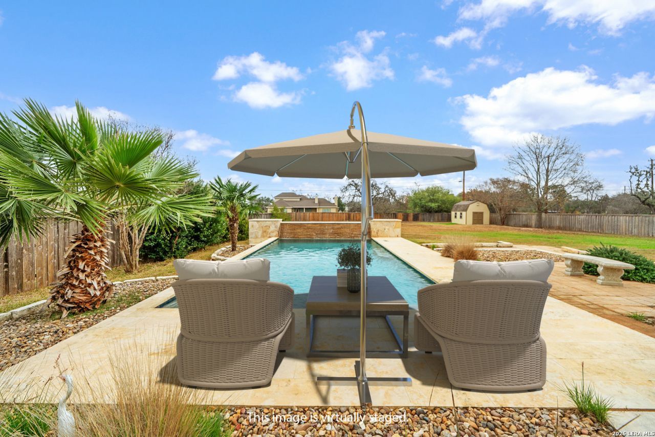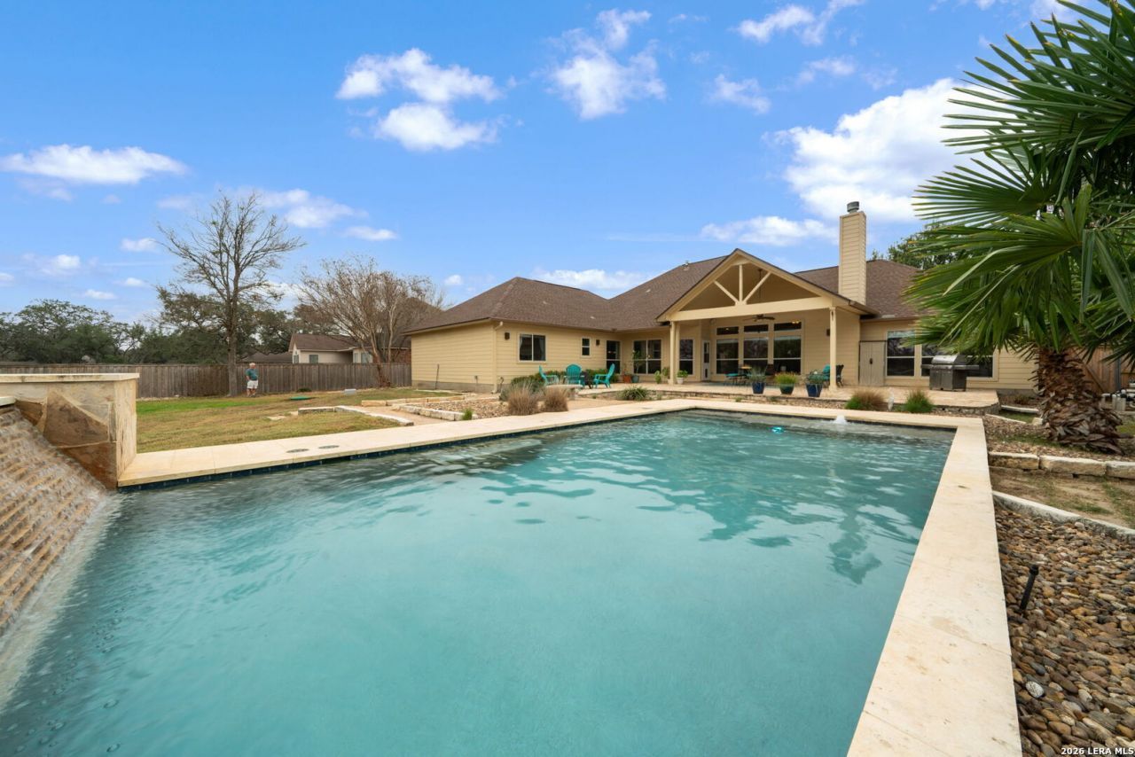 Located on a spacious .69-acre lot, almost 3/4 of an acre, in the gated community of Wind Gate Ranch, this move-in-ready home offers refined living with privacy and style. Featuring 4 bedrooms, 3 bathrooms, single story, and a 2-car garage, the open-concept layout showcases high ceilings, abundant natural light, elegant porcelain tile flooring, a statement fireplace, and paid-off solar panels. The kitchen is beautifully designed with a large island, walk-in pantry, ample cabinetry, and tiled backsplash, flowing seamlessly into the dining area. The private primary suite is thoughtfully separated and features dual oversized walk-in closets, expansive vanities, and a walk-in shower. Enjoy a private, fenced backyard with lush green space, a resort-style pool with waterfall, and multiple seating areas, perfect for entertaining or relaxing under the Texas sky. Conveniently located near SeaWorld, Lackland AFB, shopping, dining, and major highways including Loop 410 and Hwy 151.